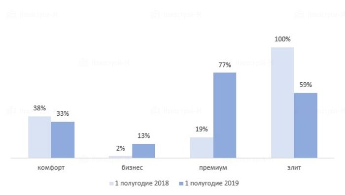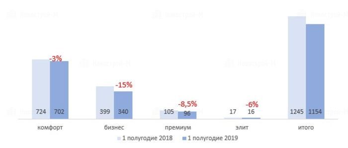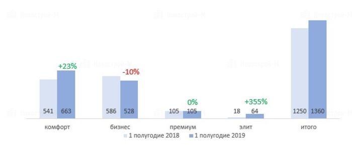 Совокупный выход нового предложения повысился с 1,25 млн кв. м в первом полугодии 2018 года до 1,36 млн кв. м в первом полугодии 2019 года. В разрезе сегментов новостроек в комфорт-классе рост составил 23% – с 541 тыс. кв. м до 663 тыс. кв. м, в элит-классе выход нового предложения увеличился в 3,5 раза – с 18 тыс. кв. м до 64 тыс. кв. м. При этом в категории «бизнес» отмечено снижение показателя – с 586 тыс. кв. м до 528 тыс. кв. м, или на 10%, в то время как рынок премиум сегмента остался стабилен.