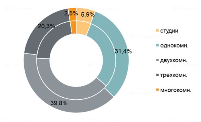 Структура предложения по типологии почти не изменилась. Двухкомнатные и однокомнатные квартиры занимают лидирующие позиции в объеме предложения (39,8%, +0,2 п.п. и 31,4%; +1,3 п.п. соответственно). Доля трехкомнатных лотов уменьшилась на 1,3 п.п. и составила 20,3%. Студии заняли 5,9% (-0,2 п.п.) в общем объеме квартир, многокомнатные квартиры – 2,5% (0 п.п.).