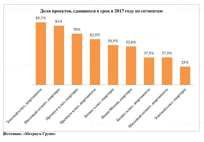 Самый большой процент просрочки эксперты «Метриум Групп» обнаружили в сегменте элитных жилых комплексов: из восьми заявленных проектов только 2 (25%) получили разрешение на ввод в эксплуатацию в 2017 году. Напротив, у элитных апартаментных комплексов оказался лучший показатель по соблюдению сроков – сдались 6 из 7 проектов (85,7%).