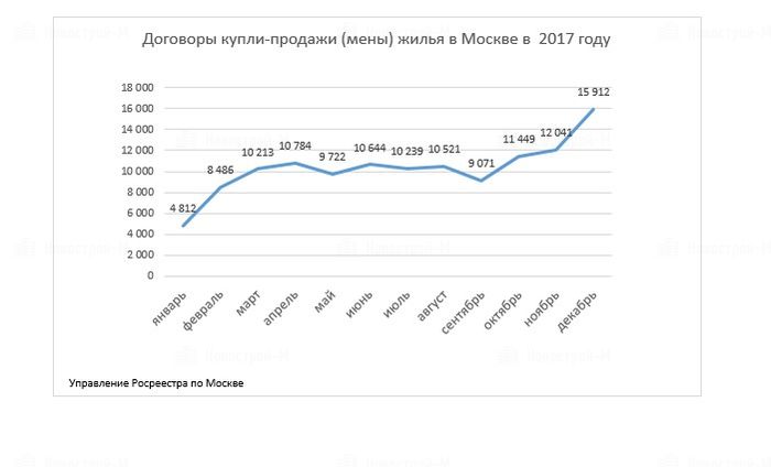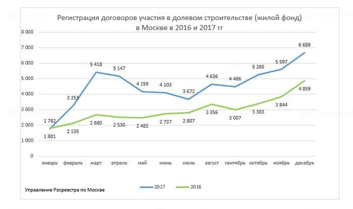 В декабре 2017 года управление Росреестра по Москве зарегистрировало 6 689 договоров участия в долевом строительстве (ДДУ) жилья, что на 19% больше, чем в ноябре прошлого года (5 597 договоров) и на 37% больше, чем в декабре 2016 года (4 859). Всего же по итогам 2017 года в столице зарегистрировано 54 207 ДДУ на жилье, против 35 621 – в 2016 году (рост +52%).