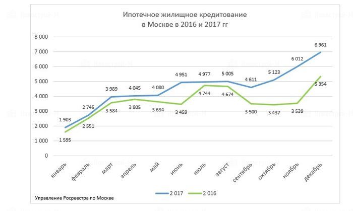 Значительный рост отмечен и на московском рынке ипотечного жилищного кредитования. Если в 2016 году столичным управлением Росреестра зарегистрировало 43 876 ипотечных сделок, то в 2017 – 54 402 (+23%). При этом конец года всегда характеризуется повышенной покупательской активностью: в декабре зарегистрирован 6 961 ипотечный контракт, что на 15% больше, чем в ноябре 2017 года.