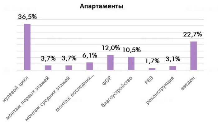 По стадиям строительной готовности большая часть предложения апартаментов — порядка 40,2% — находится на начальной стадии (нулевой цикл и монтаж первых этажей). На стадии введенных объемов представлено 22,7% апартаментов.
