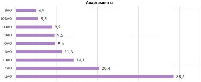 Как отмечают в «Бон Тон», большая часть предложения апартаментов сосредоточена в 3 округах: САО (29,9%, 14 проектов), СВАО (23,2%, 15 проектов) и ЦАО (22,6%, 22 проекта). Минимальный показатель в ВАО и ЮВАО — здесь находится 0,8% и 0,4% апартаментов, соответственно. Доля остальных округов представлена в диапазоне от 3,8% до 9,1%.