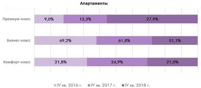 За 2018 год вышло на 54% проектов больше, чем в 2017 году. Прирост апартаментов отмечался в сегментах бизнес и премиум — за 12 месяцев в реализацию вышло 17 проектов. Что касается объема корпусов, то здесь отмечалась положительная динамика по всем классам. В комфорте прирост нового предложения составил 60%, в бизнес-классе — в 2,5 раза, в премиум-классе в 3,5 раза. Например, если в 2017 году вышло 7 корпусов с апартаментами бизнес-класса, то в 2018 году — 18 корпусов.