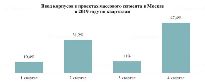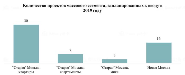 Суммарно в сдающихся в 2019 году проектах и отдельных корпусах в новостройках массового сегмента предлагается около 6 тыс. квартир и апартаментов или 21% от общей экспозиции в жилых и апартаментных комплексах эконом- и комфорт-класса. 27,6% предложения в запланированных к вводу корпусах – это квартиры в Новой Москве. 57,6% – жилье в старомосковских проектах. И только 14,8% относится к апартаментам.