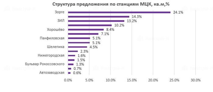 Лидером по количеству предложения в пешей доступности является МЦК «Зорге» (99,7 тыс. кв. м). Его доля составляет 24,1%, а в реализации находятся 3 проекта: ЖК «Хорошевский» в районе Хорошево-Мневники на территории СЗАО, а также ЖК «Зорге 9» и «Рихард» в Хорошевском районе в САО. Далее идет МЦК «Деловой центр» с долей на уровне 14,3%. Здесь представлены «IQ квартал», Neva Towers, «ОКО» и «Федерация» (59 тыс. кв. м). Также в лидерах – МЦК «ЗИЛ» (13,2%). Здесь находятся ЖК «ЗИЛАРТ и «Парк Легенд» (55 тыс. кв. м).
