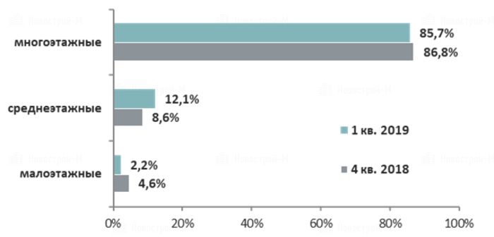 В I квартале продолжилась тенденция сокращения объема лотов в многоэтажных корпусах. Их доля снизилась на 1,1 п. п. и составила 85,7%, тогда как предложение в домах средней этажности увеличилось на 3,5 п. п. до 12,1%. Процент лотов, реализуемых в составе малоэтажной застройки, составил 2,2% (-2,4 п. п.) соответственно.