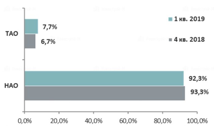 Средняя цена квадратного метра на первичном рынке жилья Новой Москвы по итогам I квартала 2019 находилась на уровне 117 230 руб., что на 2,5% больше показателя конца прошлого года. В разрезе округов она составила 121 680 руб. в НАО и 69 260 руб. в ТАО (+2,8 и +1,5 п. п. относительно прошлого квартала). Причиной роста показателей стали структурные изменения предложения и повышение цен в преобладающем количестве проектов.