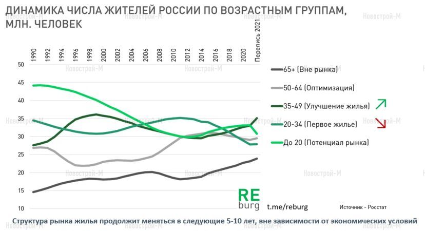 Рынок жилья России по-прежнему во многом работает за счет многочисленных поколений 70-х и 80-х годов. Им сейчас от 32 до 52 лет. Именно эти покупатели в предыдущие 10-20 лет приобретали свое первое жилье, а сейчас улучшают жилищные условия.