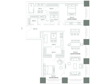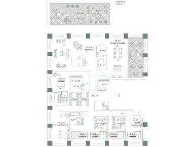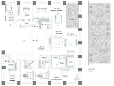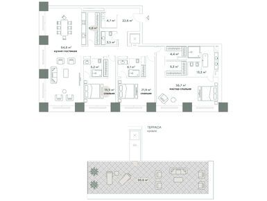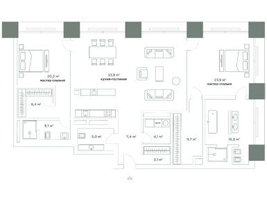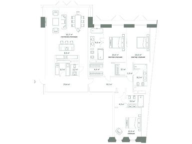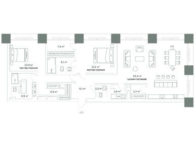 Все планировочные решения в проекте являются эксклюзивными. Площади апартаментов начинаются от 68 кв. м, во всех лотах предусмотрены панорамные окна и готовая отделка с использованием премиальных материалов. При желании, соседние апартаменты могут быть объединены. На верхних этажах расположатся пентхаусы с террасами площадью до 200 кв. м.