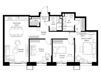 В конце апреля 2025 года в продаже есть 462 квартиры в двух жилых корпуса: от 1-комнатных площадью 37,63 кв. м до двухуровневых 3-комнатных площадью почти 170 кв. м. Квартиры продаются без отделки, цены — от 10 млн рублей.
