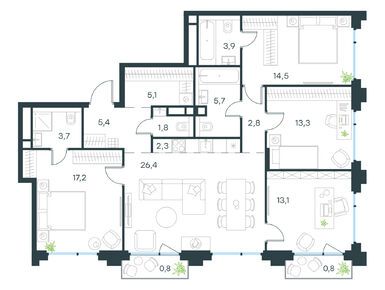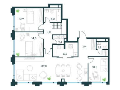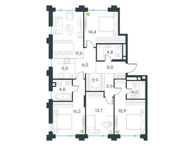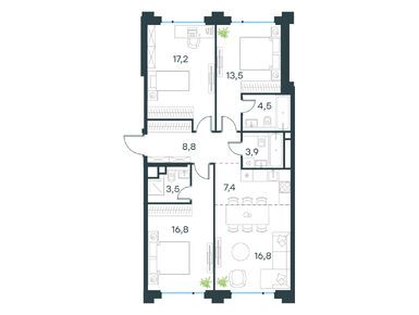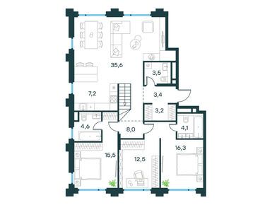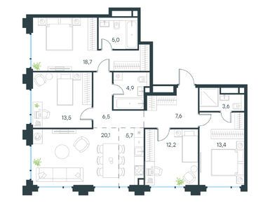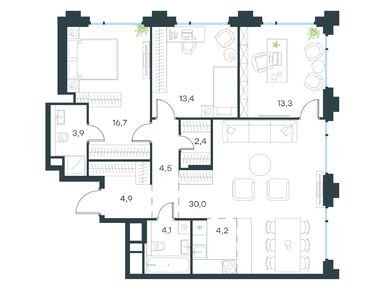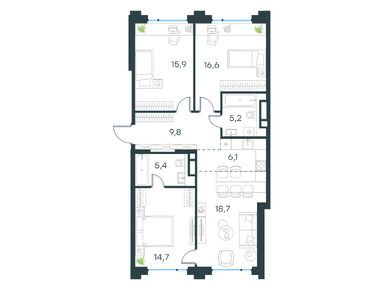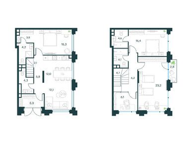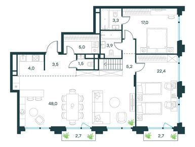 Квартирография проекта представлена типовыми планировочными решениями и редкими форматами жилья. Здесь есть квартиры от студий до пятикомнатных, площадью от 22 до 150 кв. м. Для ценителей живописных видов предлагаются лоты с балконами и террасами, с трехсторонней ориентацией окон и с окном в ванной. На верхних этажах расположены пентхаусы с увеличенной высотой потолков и возможностью установки дровяного камина.