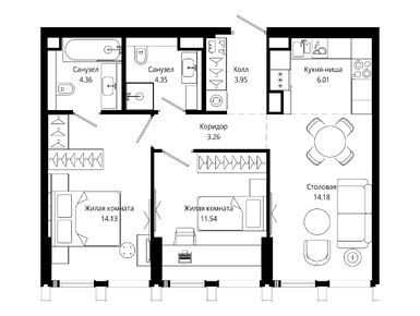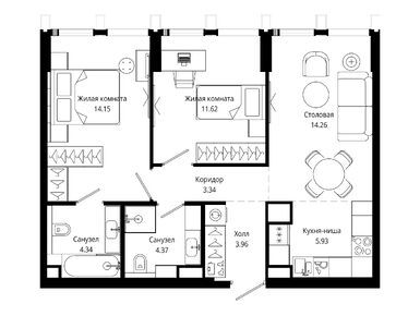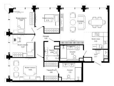 Шесть верхних этажей двух 55-этажных башен отданы под роскошные пентхаусы, где высота потолков будет доходить до 4,8 м. Жилой фонд ЖК Mod очень богат: здесь можно купить как 27-метровую студию, так и 113-метровую четырехкомнатную квартиру с прекрасно продуманной планировкой. Всего в проекте 2104 квартир и 44 апартамента, среди них варианты с панорамным остеклением от стены до стены или треугольными эркерами. Большинство лотов в ЖК «Мод» предлагается с предчистовой отделкой Mr Base, но можно купить квартиру и с отделкой MR Ready (чистовая под ключ).