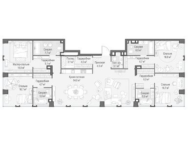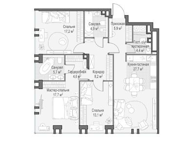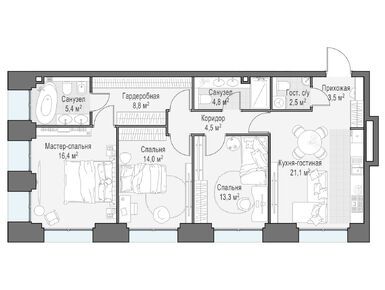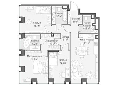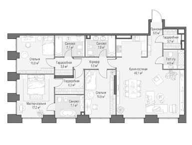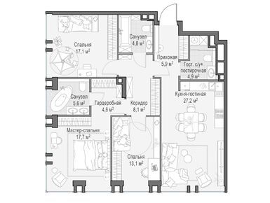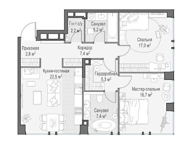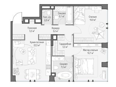 В среднем на каждом этаже корпусов запроектированы по три квартиры. Всего застройщик предлагает 94 варианта планировочных решений, имеются видовые пентхаусы с террасами и дровяными каминами, а также sky-виллы на высоких этажах. Всего в домах будет 511 квартир, включая 28 пентхаусов без отделки. В каждой квартире есть мастер-спальня и кухня-гостиная.