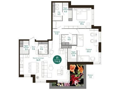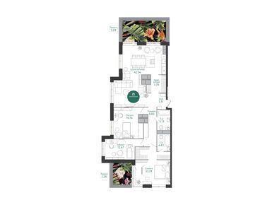 Покупателям предлагается широкий выбор квартир от студий до трехкомнатных, площадью от 24 до 148 кв. м. Планировочные решения определяются формой здания: здесь есть комнаты со скошенными углами, треугольными лоджиями, парящими в воздухе балконами. Евроформат квартир позволяет эффективно использовать каждый метр.