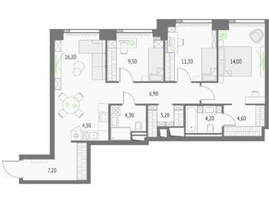 В домах запроектированы около 200 вариантов планировок, сейчас для покупки доступны 593 квартиры в корпусах «Олимп», «Атлас», «Эльбрус» и «Монблан» — студии, одно-, двух- и трехкомнатные варианты.