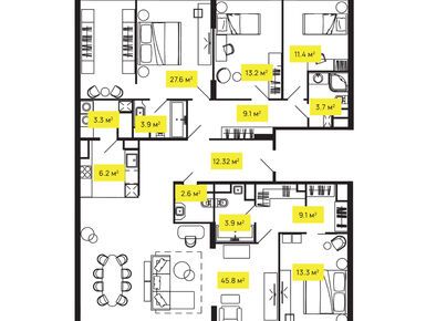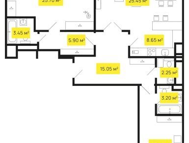 В квартирографии проекта – лоты от компактных студий до просторных пятикомнатных пентхаусов. Во всех квартирах высокие потолки и широкие окна, представлены варианты с эргономичными кухнями-гостиными, отдельными обеденными зонами, мастер-спальнями, несколькими санузлами, гардеробными и прачечными помещениями, а также видовые пентхаусы с трехметровыми окнами на 2 стороны света.