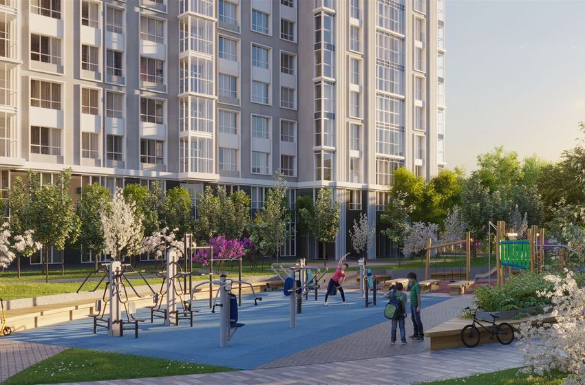 Благоустройство территории комплекса включает в себя зеленый прогулочный двор, в котором обустроят места отдыха с беседками, универсальную спортивную площадку и игровые площадки для детей разных возрастов. Двор будет охраняемым, с видеонаблюдением и контролем доступа, свободным от машин. Для удобства жителей также предусмотрены автомойка и система хранения велосипедов.
