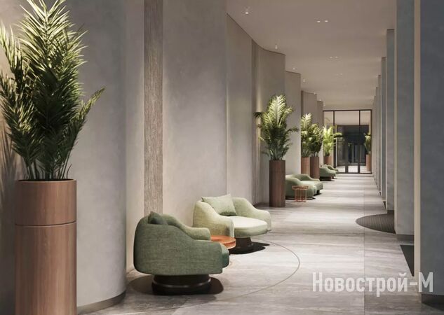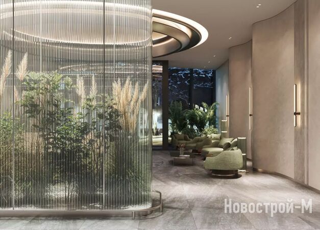 Центральное лобби — это светлое пространство с высокими потолками и панорамным остеклением. Дизайн-проект для лобби разработан студией Haast. Для внутренней отделки будут использованы премиальные материалы серо-бежевых оттенков, пол также будет светлым. Дизайнерская мебель и декор создадут ощущение домашнего уюта.