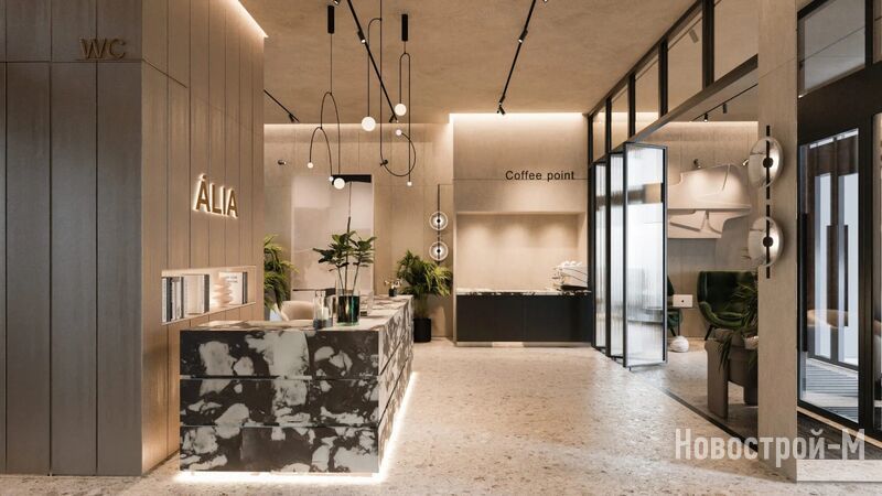 Высота потолков в лобби достигает 4,5 м, а панорамное остекление делает пространства еще светлее и просторнее.