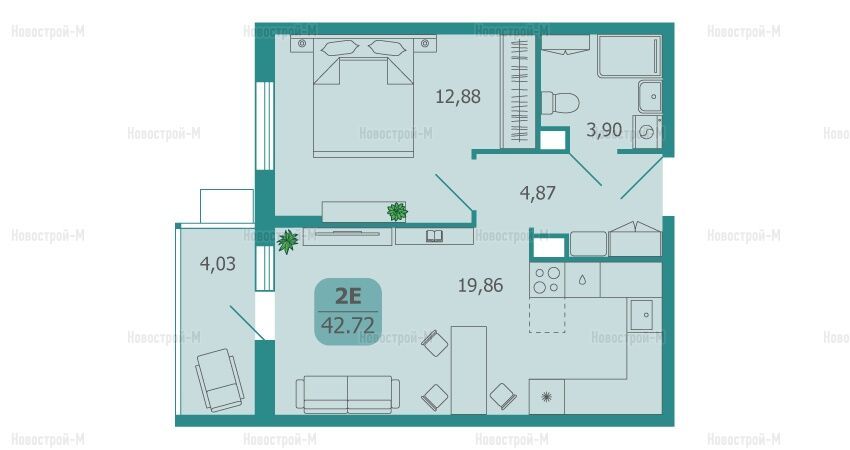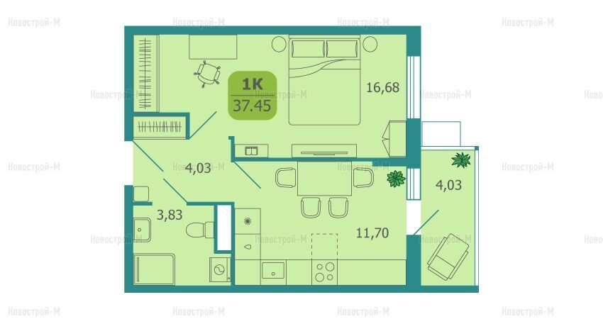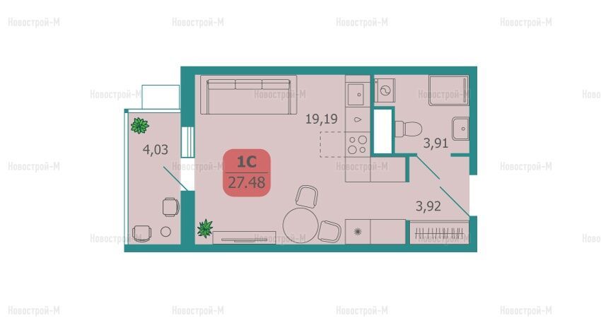 Самые компактные варианты в проекте — студии площадью 27,4 – 33 кв. м. Большинство таких квартир имеют классическую прямоугольную форму, совмещенный санузел и просторную лоджию метражом 4–5 кв. м. В прихожих есть место под встраиваемый шкаф. Также есть студии-трансформеры, в которых можно разделить зону спальни и столовой перегородкой. В спальне и прихожей выделены ниши для гардеробной и кладовой.