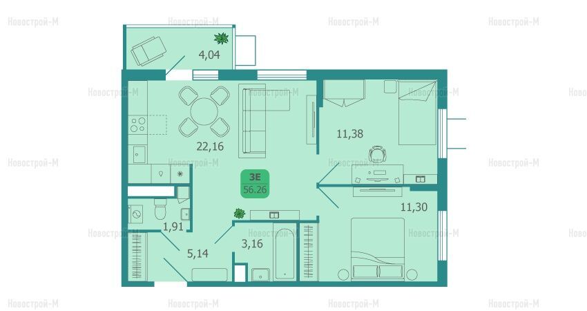 Классические двухкомнатные квартиры представлены несколькими вариантами планировок: линейные, угловые, распашные (с окнами на противоположные стороны света). Площадь таких квартир значительно больше — 52–58 «квадратов». Здесь раздельные санузлы, восьмиметровые прихожие, выход на лоджию из кухни или спальни.