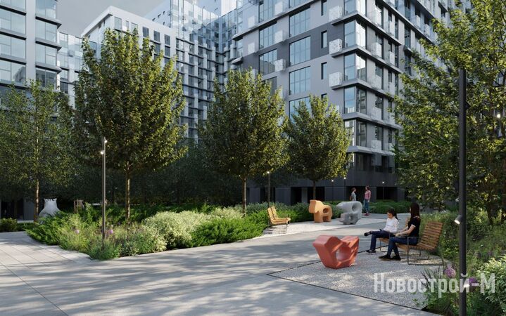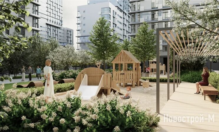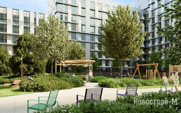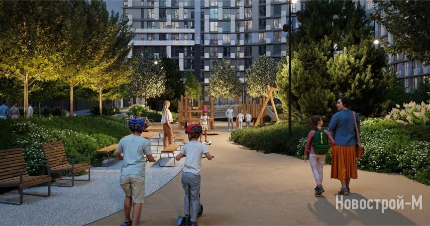 Во дворе будет выполнен ландшафтный дизайн, будут созданы места для спокойного отдыха и общения, спортивные площадки с турниками и уличными тренажерами. Также во дворе разместятся три игровые площадки, ориентированные на детей разного возраста: для самых маленьких 0+, для активных исследователей в возрасте до 5 лет, для детей постарше — от 6 до 12 лет. На детских площадках будет установлено соответствующее возрастам игровое оборудование: горки, качели, песочницы. Избежать травм во время активных игр позволит мягкое резиновое покрытие.