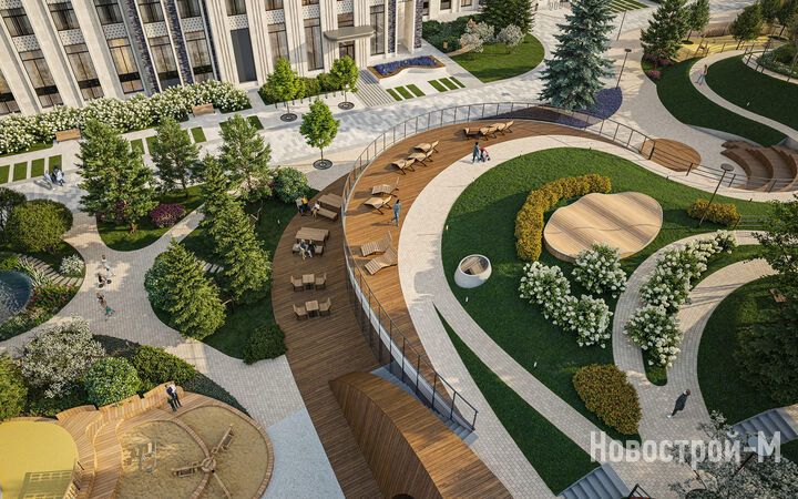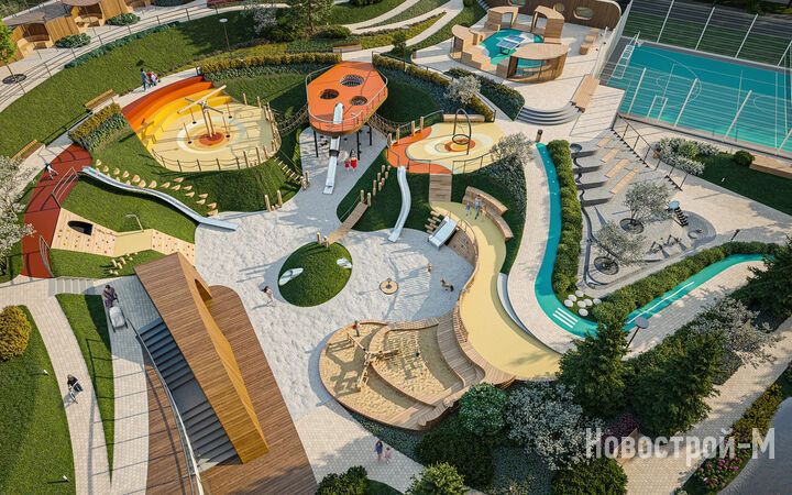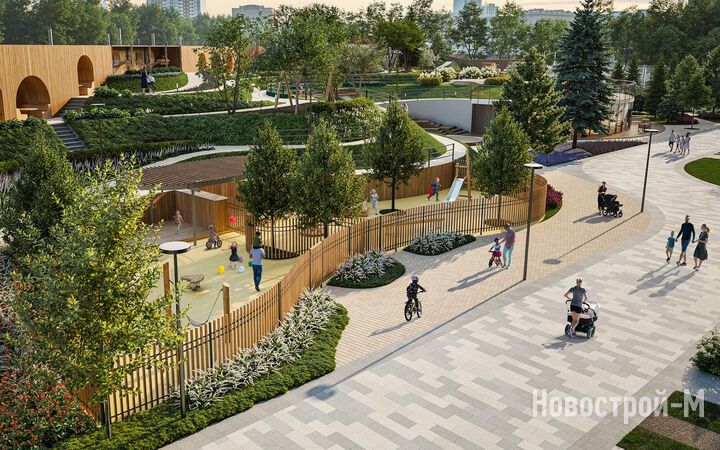 Отдельного внимания заслуживает детская площадка площадью 910 кв. м, созданная по стандарту Kid’s Lab. Это развивающее пространство для детей разных возрастов: здесь есть горки, песочницы, качели, веревочные лабиринты, скалодром, а также сенсорные и звуковые механизмы. Детская площадка находится в отдалении от зон спокойного отдыха для взрослых.
