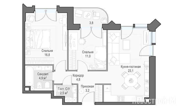 Полторы сотни вариантов планировок и широкий размерный ряд позволяют выбрать квартиру, которая наилучшим образом будет отвечать потребностям семьи, а отсутствие перегородок и отделки в квартирах дает свободу в реализации дизайнерских идей.