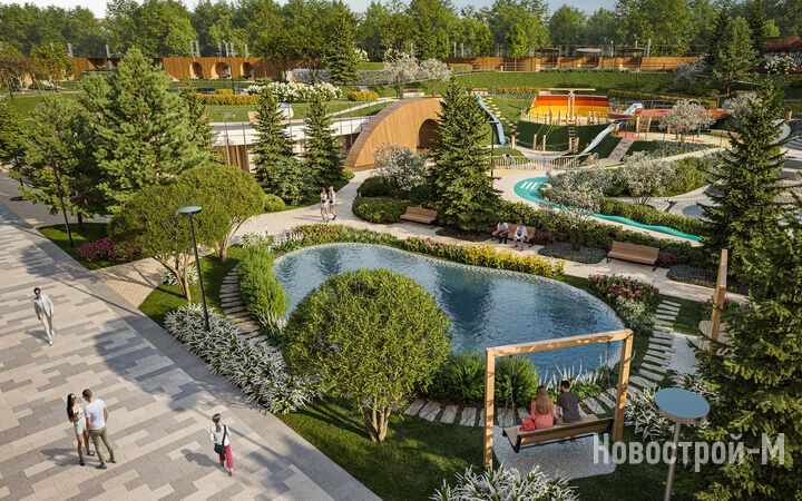 При разработке ландшафтного парка учитывались интересы жителей разных возрастов и с разным образом жизни. Здесь можно прогуливаться у пруда, пить кофе на террасе общественной гостиной, отдыхать на лавочках и в гамаках, в том числе под навесами, или гулять по бульвару и дорожкам. Пандусы обеспечивают плавный переход между площадками, расположенными на разной высоте.