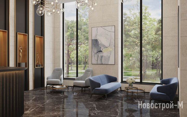 Стиль ар-деко продолжается и во внутренней отделке: декоративные элементы присутствуют в лобби, коридорах и паркинге. Лобби представляют собой функциональные пространства с дизайнерским ремонтом и мебелью: здесь есть уютная зона ожидания с камином, ресепшн с круглосуточным консьерж-сервисом, гостевой санузел и колясочная. Для декорирования стен лобби использованы элементы из латуни, а также более темные акцентные украшения, которые перекликаются с архитектурной концепцией проекта.