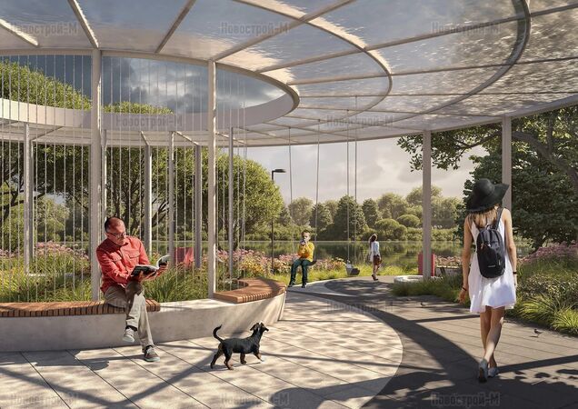 Особое внимание дизайнеры уделили зоне отдыха у воды. Здесь появится особенный объект — индивидуальная пергола, напоминающая волну. Покрытие перголы пропускает солнечные лучи и создаёт преломления света, напоминающие водную рябь. «Речная» тема прослеживается и в других объектах благоустройства.
