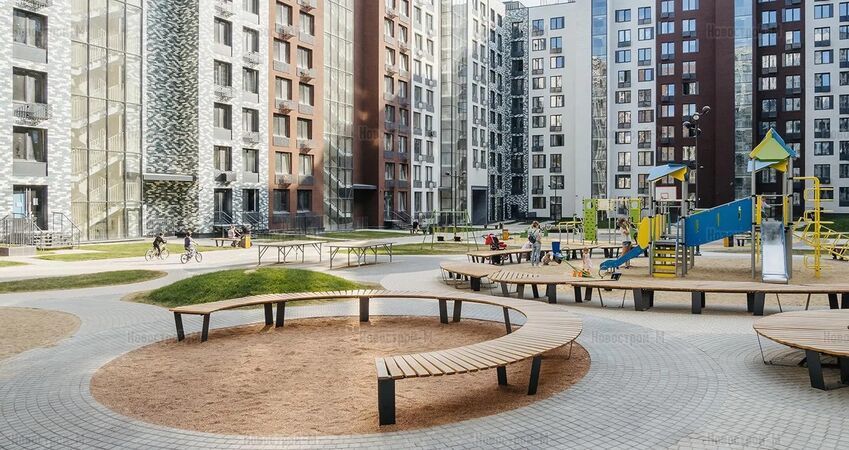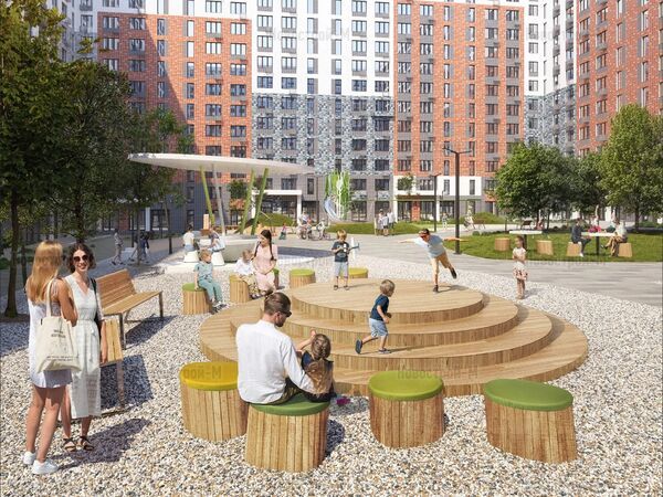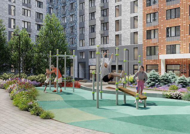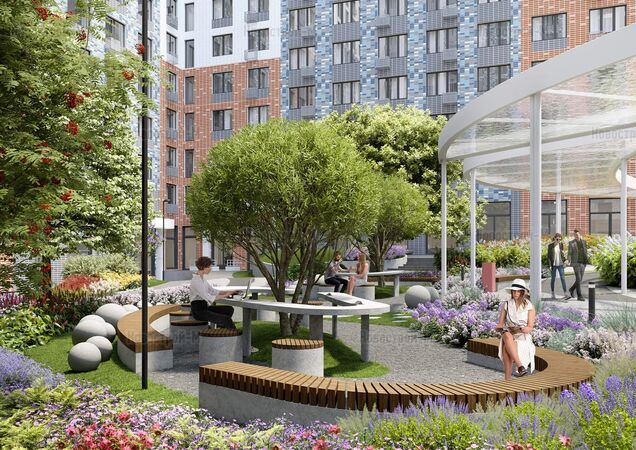 Во дворе предусмотрено много мест для спокойного отдыха, есть зона сцены, открытая экспозиция и ленд-арт-парк. Во дворе нашлось место для спортивной площадки с тренажерами и детских активностей.