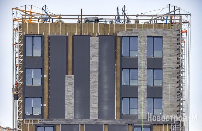 В отделке фасада используется натуральный камень на первом этаже, а выше — бетонная плитка нескольких оттенков, алюминиевые ребристые и композитные панели. Сохранить внешнюю эстетику позволят технические балконы, куда будут вынесены внешние блоки кондиционеров.
