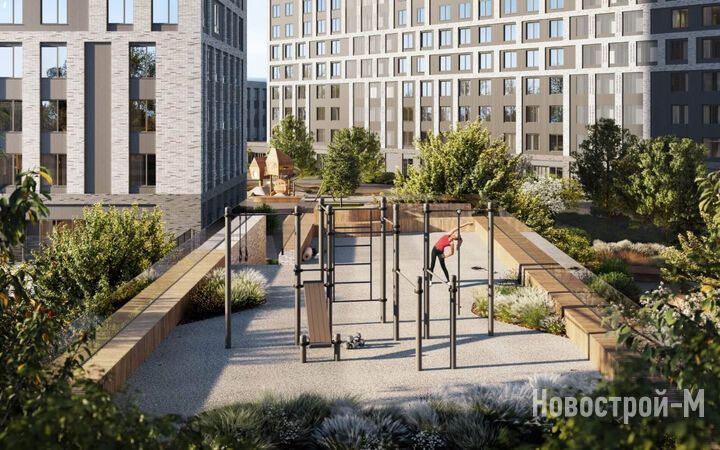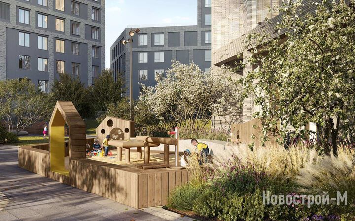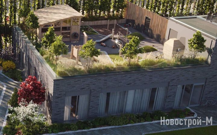 Двор будет разделен на функциональные зоны. Здесь появится площадка для выгула и дрессировки собак, спортивная зона и детский городок в стиле скандинавской деревни. На крыше здания детского сада будет создан экологичный плейхаб площадью 327 кв. м.