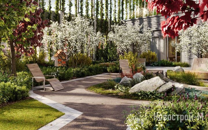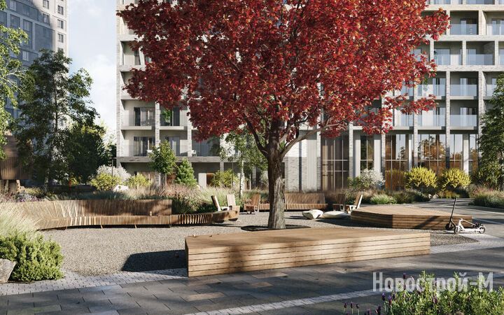В ландшафтном дизайне от бюро Gillespies находит продолжение образ скандинавской природы. На внутриквартальной территории, закрытой от машин и посторонних, появится сеть пешеходных дорожек, мощенных колотым гранитом, тропинки, отсыпанные гранитной крошкой, а также зеленые островки. Дополнят образ скандинавского двора натуральные валуны и необработанные каменные поверхности. В центре двора появится раскидистое дерево (отсылка к древу жизни из скандинавской мифологии). Также будут высажены канадская ирга, горная сосна, приречный клен, гортензии и папоротники.