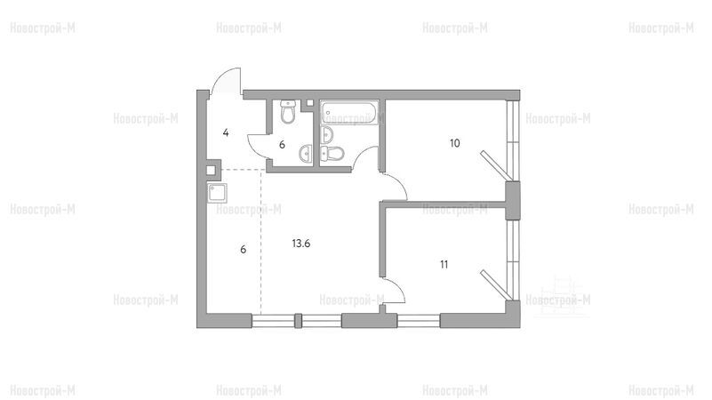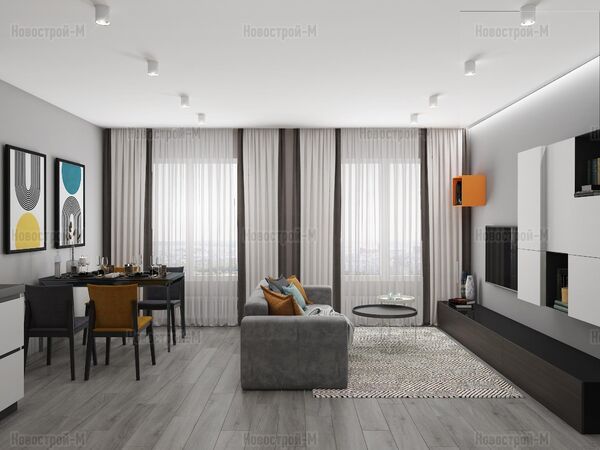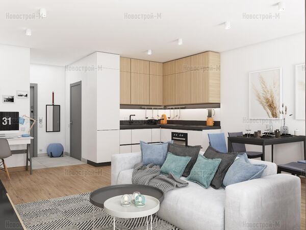 В комплексе можно выбрать помещения площадью от 23,4 до 63,6 кв. м. Это студии, двух- или трёхкомнатные лоты евроформата с возможностью свободной планировки. В любом из вариантов предусмотрена кухня-ниша, а также панорамное или эркерное остекление. Можно выбрать помещения квадратной формы или более вытянутые с проходной гостиной, в которой будет сразу 4–5 окон.
