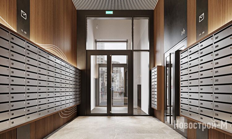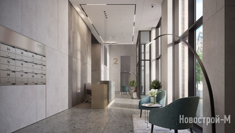 Минимализм продолжается и во внутренней отделке общих зон: холлов и лобби. В лобби запроектированы высокие потолки и большие витринные окна. Дизайнерская отделка, мебель, декор и освещение подчеркнут высокий статус жилого комплекса. При входе появится уютная зона ожидания, зона почтовых ящиков, гостевой санузел.