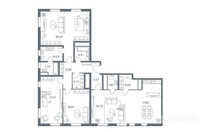 В проекте iLove преобладают квартиры семейного формата с одной или несколькими изолированными комнатами, мастер-спальнями, несколькими санузлами, общими гардеробными и просторными гостиными для семейных и дружеских вечеров.