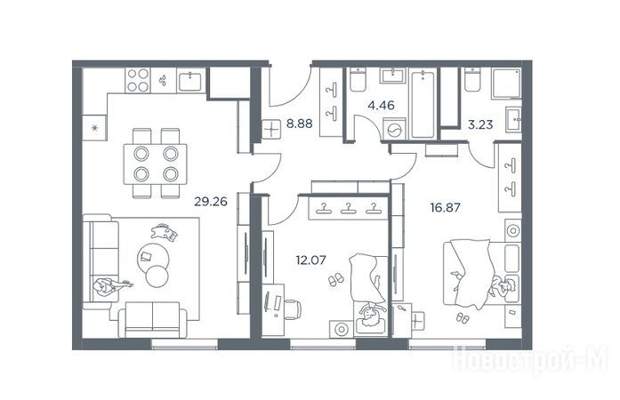 Проект ориентирован на семейных покупателей, что подтверждается его квартирографией: более половины лотов здесь с несколькими спальнями. Кроме того, на территории комплекса предусмотрены детские площадки, а в перспективе нескольких лет появится и собственный детский сад.