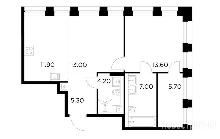 Площади классических двухкомнатных квартир начинаются от 58,3 кв. м. Такие лоты имеют по два санузла, в некоторых есть мастер-спальни и гардеробные. Особенно интересны угловые варианты, в которых много окон, через которые проникает больше естественного света, да и задерживается он в квартире дольше.