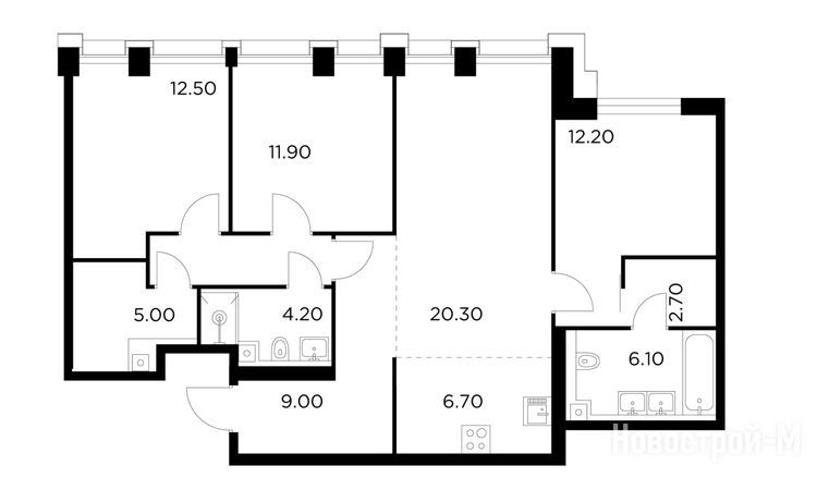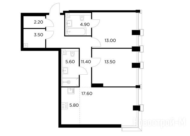 Самые большие по площади — угловые «еврочетырешки»: здесь у каждой спальни предусмотрена собственная гардеробная и еще одна общая, по два санузла и отдельная постирочная комната. В одной из комнат угловое панорамное остекление. Общая площадь более 120 кв. м.