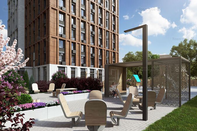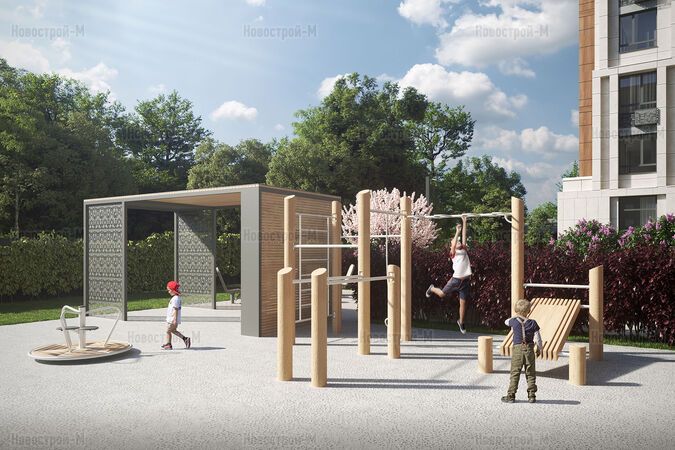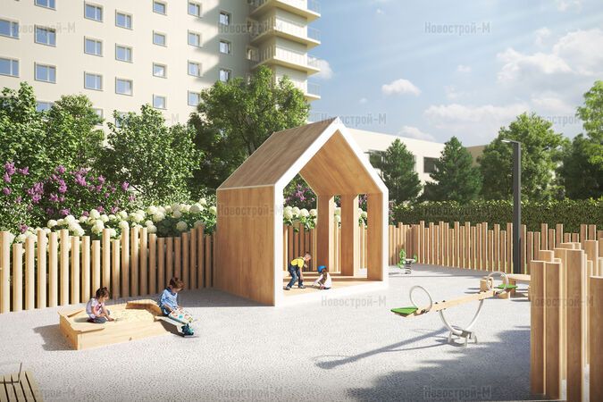 Благоустройство безопасного внутреннего двора, закрытого от автомобилей, включает три игровые площадки для детей разного возраста, спортивные площадки с workout, прогулочные дорожки и места для тихого отдыха с беседками. Разграничивать функциональные зоны будут деревья и кустарники: растения подберут так, чтобы обеспечить практически непрерывное цветение. Здесь высадят гортензии, сирень, барбарис, розы и др. Предусмотрена гостевая парковка.