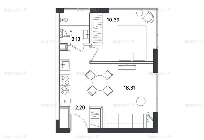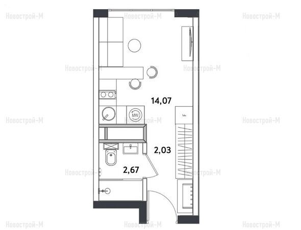 Самые компактные и многочисленные — апартаменты-студии. Это помещения прямоугольной формы. В студиях есть совмещенный санузел, компактная зона хранения в прихожей и оборудованная мини-кухня. Общая площадь варьируется от 18 до 27 кв. м.