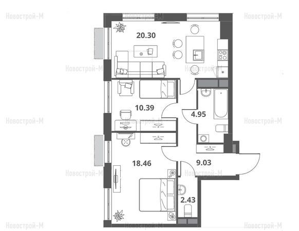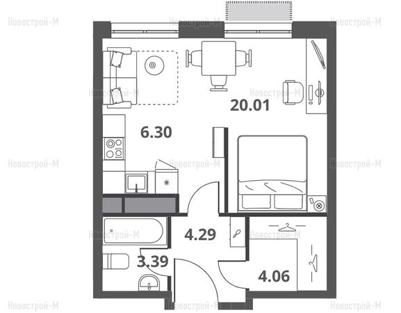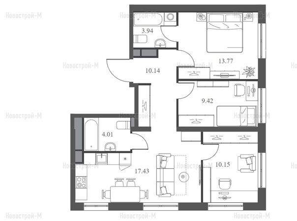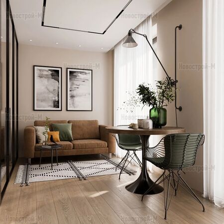 Самые компактные квартиры – студии, их площадь от 22,9 до 33,9 кв. м, они представлены в пяти типах планировочных решений. В большинстве из них есть возможность зонировать пространство, например, обособить спальное место с помощью перегородки. В однокомнатных есть возможность объединить комнату с кухней или изолировать каждое помещение, также во многих квартирах предусмотрены гардеробные площадью 4 кв. м. Двухкомнатные квартиры есть и малометражные – от 31,68 кв. м (европланировка), и стандартные – до 52 кв. м. В них также предоставлена возможность объединить кухню с гостиной в одно большое пространство. В самых компактных вариантах санузлы совмещенные, в более просторных «двушках» есть раздельные санузлы. В трехкомнатных квартирах уже по два санузла, кухни-гостиные, небольшие гардеробные. Четырехкомнатные квартиры, представленные в продаже, компактные – всего 69 кв. м, но в них есть мастер-спальня со своим полноценным санузлом, кухня-гостиная.
