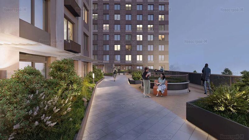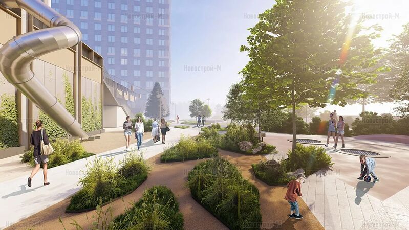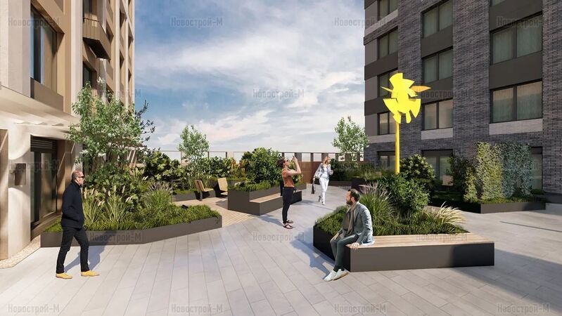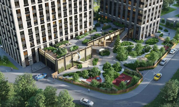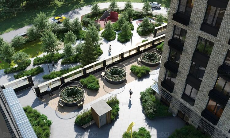 Большое внимание в проекте уделено организации дворовой территории. Между домами создается красивый оазис с ландшафтным дизайном и озеленением. Есть зона для тихого отдыха и площадки для спорта и детских игр со всем необходимым оборудованием. Общая площадь благоустройства – почти 6 тыс. кв. м. Эксплуатируемая кровля стилобата, объединяющего обе секции, станет частью двора, где можно будет отдохнуть на свежем воздухе, а летом и позагорать на небольшом собственном пляже, встретиться с друзьями, провести переговоры. Здесь же будут обустроены летний кинотеатр и сцена/площадка для йоги. Под крышей стилобата также разместится крытая велопарковка. Во дворе можно будет зарядить гаджеты. Территория двора будет огорожена и закрыта от посторонних. Доступ резидентов организуют по электронным пропускам.