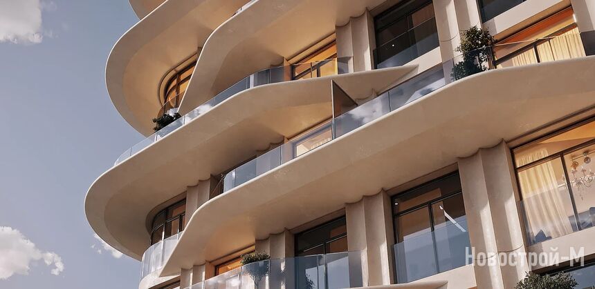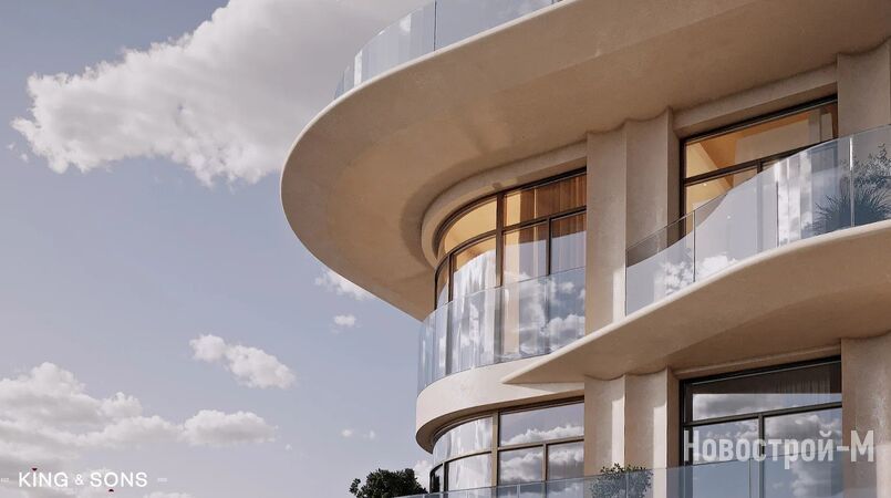 Облик дома напоминает открытый японский веер, что позволило увеличить число видовых лотов. Премиальную выразительность проекта подчеркивают фасады из натурального светлого камня, мягкие формы здания, максимально открытое моллированное остекление.