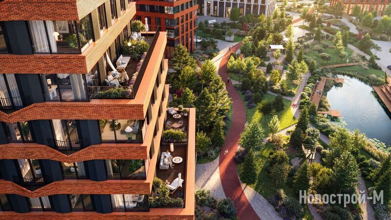 Архитектурная концепция от бюро «Остоженка» сочетает в себе современный стиль и традиции классической архитектуры. Фасад украшают панорамные окна, натуральные материалы отделки и высокотехнологичные искусственные детали. Выразительный силуэт формирует каскад квартирных террас: они словно ступени плавно спускаются к парку, создавая объемный эффект.