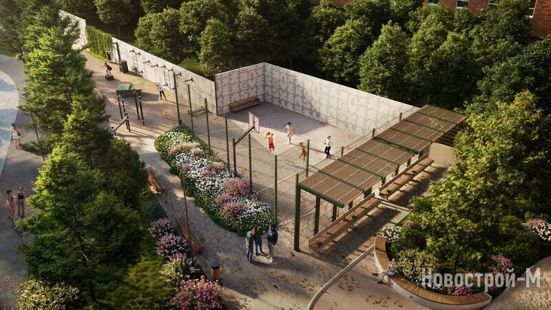Для занятий спортом во дворах будут организованы площадки для воркаута и игровых видов: баскетбола, волейбола сквоша, пинг-понга, площадки для пилатеса и йоги, скалодром, а также места для отдыха, прогулок, беговые и велосипедные дорожки.