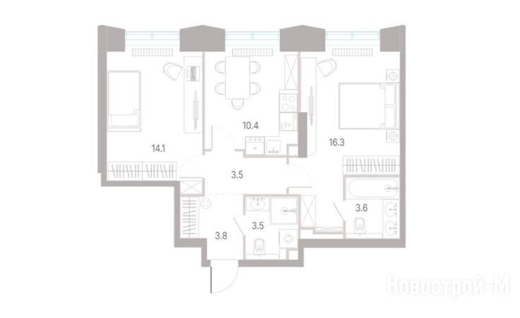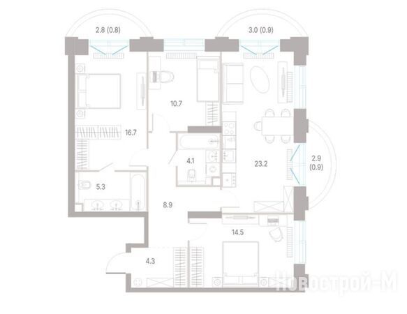 Самый дорогой вариант в имеющемся предложении – квартира площадью 118,2 кв. м на 30 этаже того же корпуса. Она продается за 67,26 млн рублей. В планировке – три спальни (две из которых идут с угловым остеклением), три санузла и просторная кухня-гостиная площадью 26,8 кв. м.